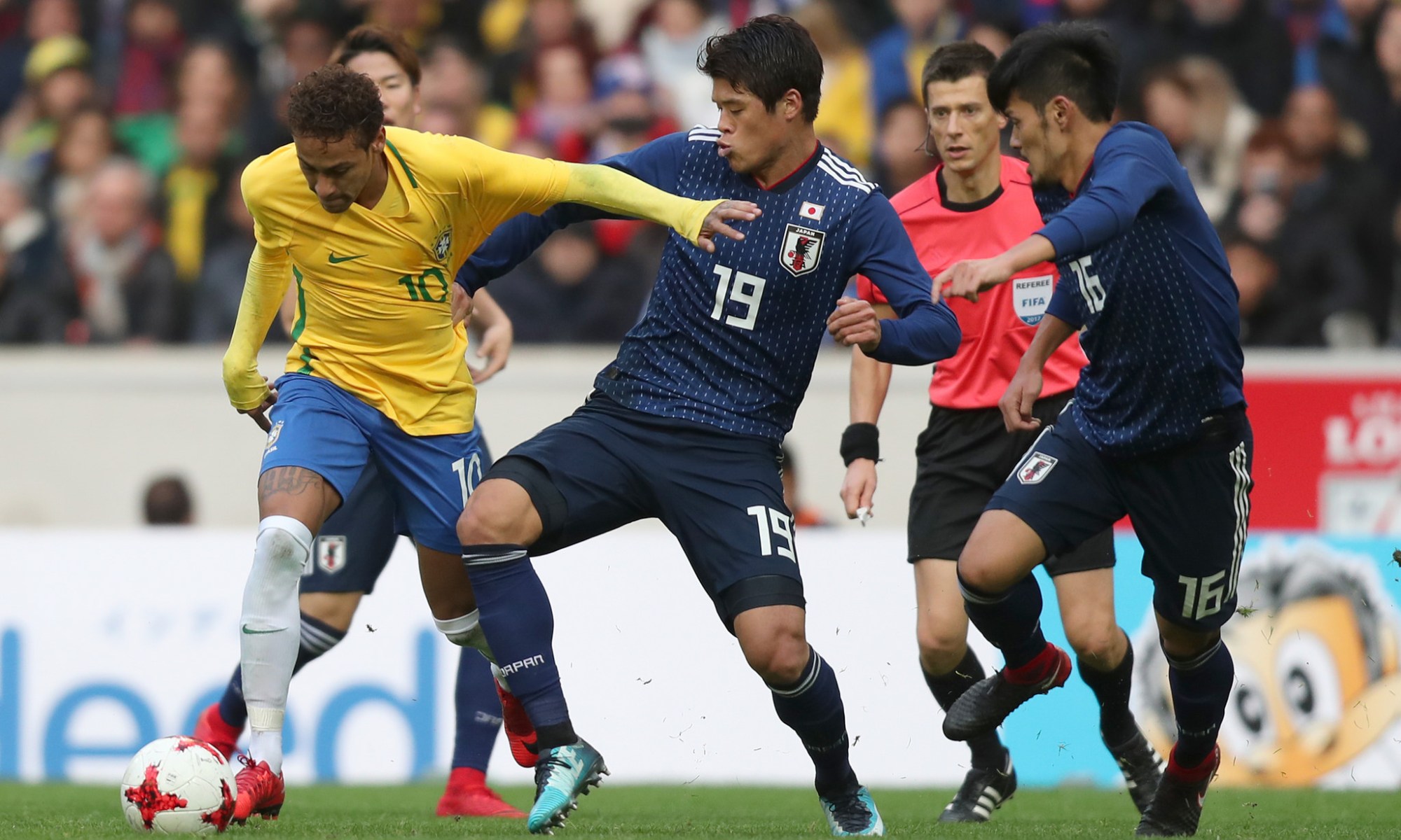 O árbitro de vídeo foi fundamental para o Brasil abrir o placar no estádio Pierre-Mauroy. Em um lance fora da disputa pela bola, Yoshida puxou Fernandinho na grande área e o árbitro Benoit Bastien não viu, mas contou com a ajuda do VAR para marcar o pênalti. Na cobrança, Neymar deslocou o goleiro e balançou as redes logo aos nove minutos de jogo.