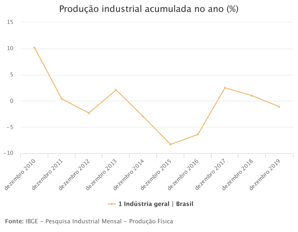 A produção nacional da indústria recuou 1,1% no ano de 2019, após dois anos seguidos de crescimento em 2017 (2,5%) e 2018 (1%). Houve, no entanto, uma redução na intensidade das perdas do primeiro (-1,4%) para o segundo semestre do ano (-0,9%), em relação a iguais períodos do ano anterior. Mesmo assim, o mês de dezembro foi de queda na produção, tanto em relação a novembro (-0,7%) quanto em relação a dezembro de 2018 (-1,2%), bem como o último trimestre do ano (-0,6%).