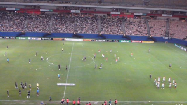 20h20 – Clima agradável para uma noite de futebol. As condições do gramado, ao menos daqui das cabines de imprensa, parecem bem melhores do que na última semana, quando o Fast enfrentou o Goiás com o campo em péssimas condições;