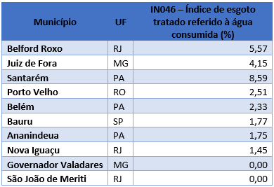 Os baixos indicadores de esgoto tratado no Brasil afetam diretamente os ecossistemas pelo lançamento in natura dos esgotos sem tratamento. Córregos, rios, lagoas e praias têm a qualidade das águas comprometidas com a carga excessiva destes resíduos sem tratamento. Os municípios que enfrentam os maiores problemas neste indicador são: