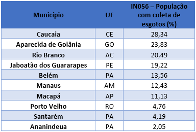 Os maiores desafios na cobertura de coleta de esgotos ainda permanecem no Norte, seguido do Nordeste. Das 10 piores cidades neste indicador, nove são do Norte ou Nordeste, com destaques para as capitais Belém (PA), Manaus (AM), Macapá (AP) e Porto Velho (RO). Lista abaixo:
