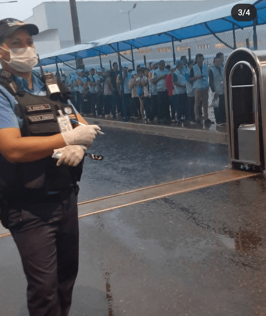 Uma imagem publicada no portal da jornalista Rosiene Carvalho (abaixo) mostra trabalhadores da Samsung do Distrito Industrial de Manaus aglomerados e sem máscara, aguardando em fila para entrar na fábrica sem máscaras.
