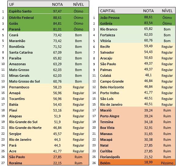 Nesta 1ª edição do ranking, Espírito Santo (97,4 pontos), Distrito Federal (88,6), Goiás (84,8) e Paraná (81) destacaram-se como os quatro únicos estados com nível “ótimo” de transparência para contratações emergenciais. Ainda sobre as capitais, os destaques ficaram com João Pessoa (PB) e Goiânia (GO), com 88,6 e 83,5 pontos, respectivamente. Elas foram as duas únicas cidades pesquisadas que se enquadraram na categoria “ótimo”.