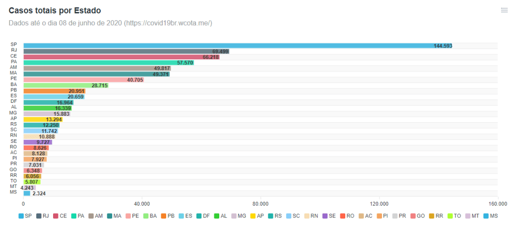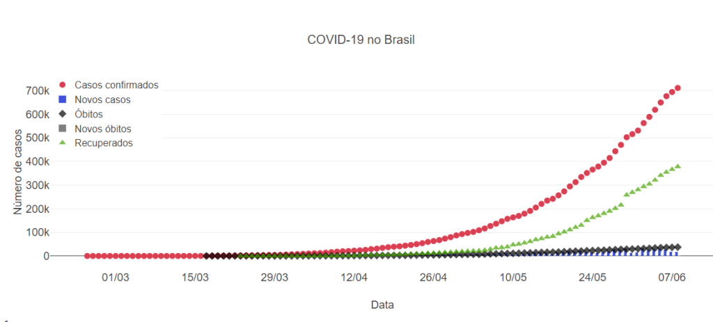 O Brasil chegou a 711.675 casos do novo coronavírus nesta segunda-feira (08). Foram registrados ao todo 37.352 óbitos em decorrência da covid-19, doença causada pelo víus, no país. Nas últimas 24 horas foram registrados foram confirmados mais 17.217 casos da doença e 768 novas mortes. Cerca de 378.257 pessoas já passaram pelo período de transmissão e estão recuperadas. A última atualização foi feita no dia 08 de junho, às 23:45:41, horário de Brasília. Você confere o número de casos de cada Estado e a curva da doença no Brasil abaixo: