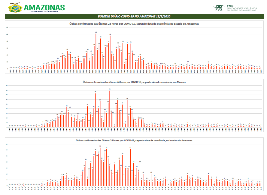 Mudança de Critérios – O Comitê Interno da Fundação de Vigilância em Saúde do Amazonas e a Secretaria Municipal de Saúde de Manaus estão realizando o processo de revisão e qualificação dos óbitos ocorridos em meses anteriores, com base nos novos critérios do Guia de Vigilância Epidemiológica do Ministério da Saúde, que passou a considerar óbitos por Covid-19 também por critérios clínicos e exames de imagens.