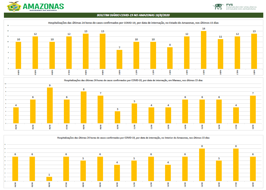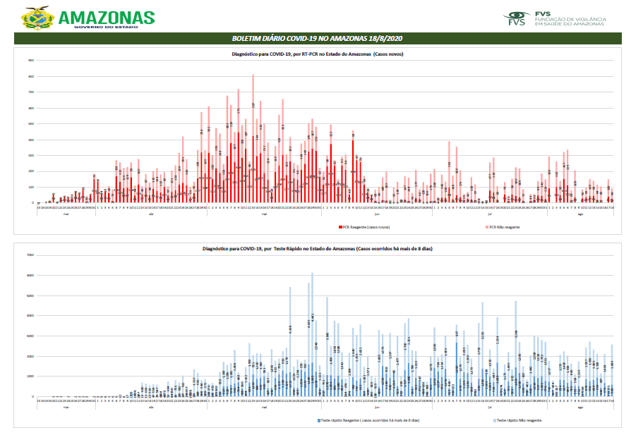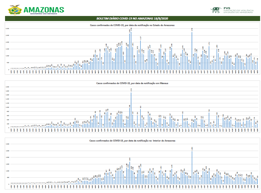 A Fundação de Vigilância em Saúde do Amazonas (FVS-AM) divulga, nesta terça-feira (18/08), a edição nº 138 do Boletim Diário Covid-19. Nesta edição, o boletim confirma mais 618 casos da doença, fazendo o total de infectados oficiais em todo o estado chegar a 112.869.