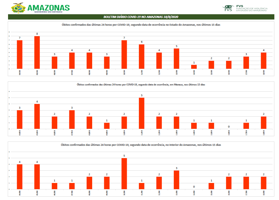 Conforme o boletim, foram confirmados quatro óbitos por Covid-19 ocorridos nas últimas 24 horas no interior, elevando para 3.509 o total de mortes. Na capital, de acordo com dados da Prefeitura de Manaus, nesta segunda-feira (17/08), foram registrados 34 sepultamentos e oito óbitos em domicílio.