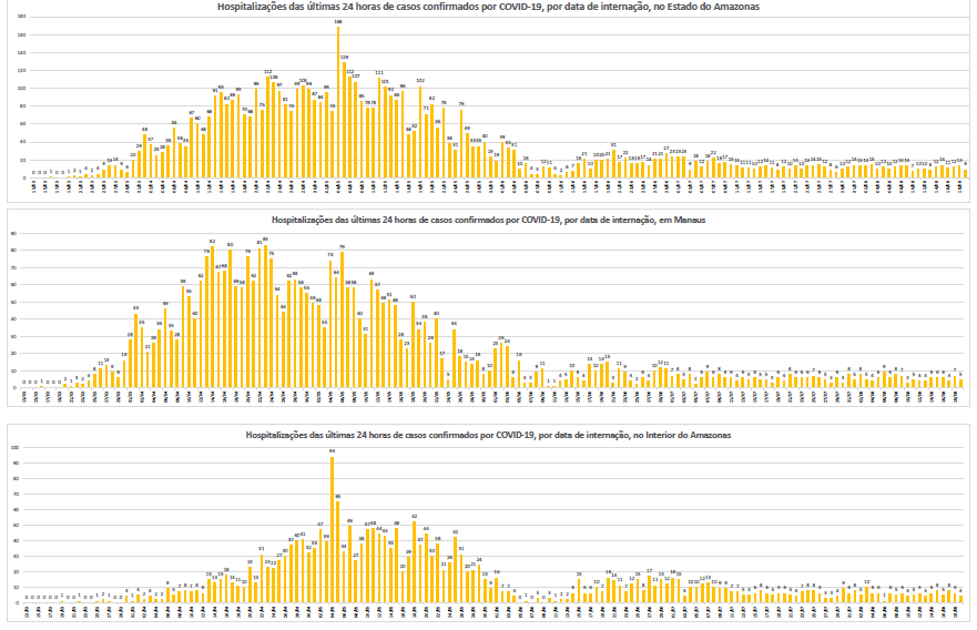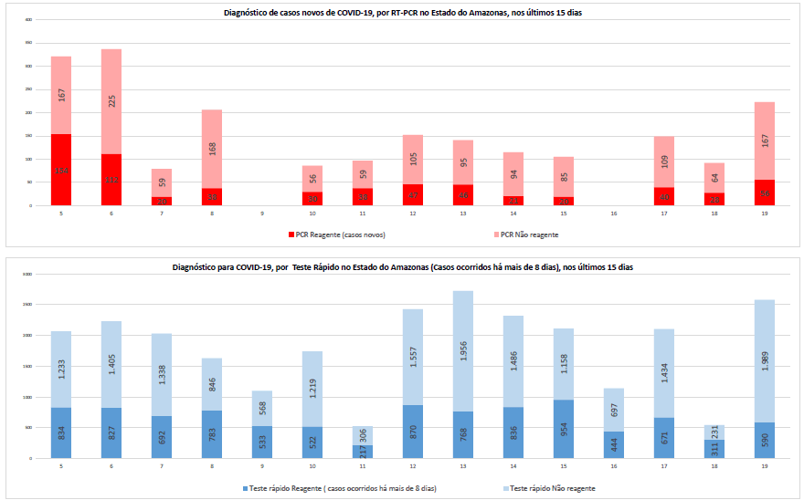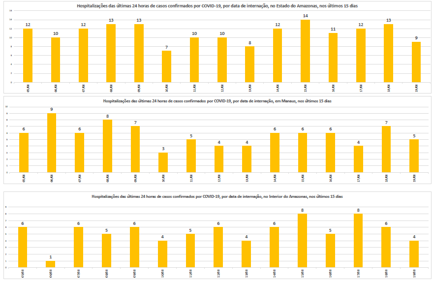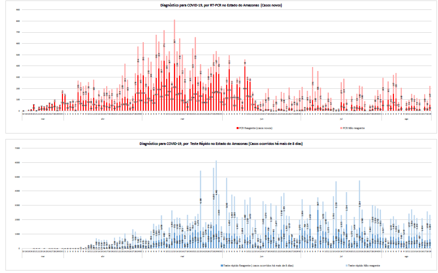 Além disso, desde segunda-feira (17/08), a FVS-AM inclui, na edição do Boletim Diário, os gráficos detalhados dos últimos quinze dias dos principais indicadores, tais como: hospitalizações, casos confirmados, óbitos das últimas 24 horas e diagnósticos por exame RT-PCR ou teste rápido, que demonstram o cenário atual da pandemia no estado.
