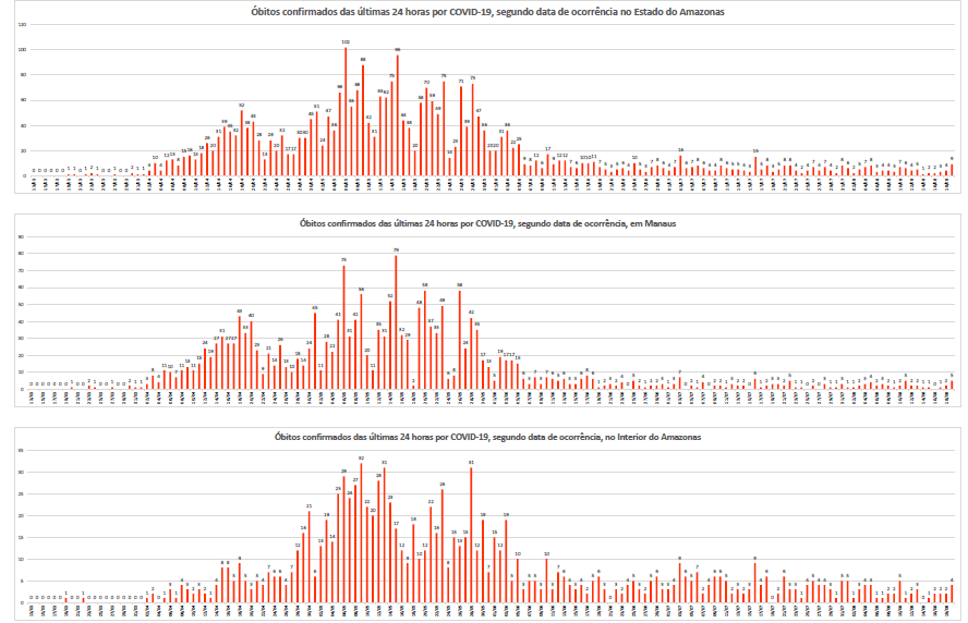 No interior, são 58 municípios com óbitos confirmados até o momento, totalizando 1.352, sendo que quatro deles ocorridos nas últimas 24 horas. A lista inclui Manacapuru (142); Parintins (107); Coari (105); Tefé (84); Tabatinga (79); Humaitá (67); Itacoatiara (61); São Gabriel da Cachoeira (49); Iranduba (46); Autazes (36); Benjamin Constant (36); Maués (33); Lábrea (30); Manicoré (27); Barcelos (24); Nova Olinda do Norte (24); Presidente Figueiredo (24); São Paulo de Olivença (23); Borba (22); Santo Antônio do Içá (20); Fonte Boa (18); Careiro (17); Jutaí (16); Rio Preto da Eva (17); Tonantins (14); Santa Isabel do Rio Negro (14); Alvarães (13); Manaquiri (12); Barreirinha (12); Guajará (11); Anori (11); Boca do Acre (11); Novo Aripuanã (11); Uarini (9); Nhamundá (9); Amaturá (8); Carauari (8); Beruri (8); Juruá (7); Novo Airão (7); Itapiranga (6); Caapiranga (6); Urucará (6); Eirunepé (5); Tapauá (5); Silves (5); Itamarati (5); Careiro da Várzea (4); Pauini (4); Atalaia do Norte (4); Urucurituba (4); Maraã (4); Codajás (3); Ipixuna (3); Boa Vista do Ramos (2); São Sebastião do Uatumã (2); Japurá (1) e Envira (1). Permanecem sem óbitos registrados: Anamã, Apuí e Canutama.