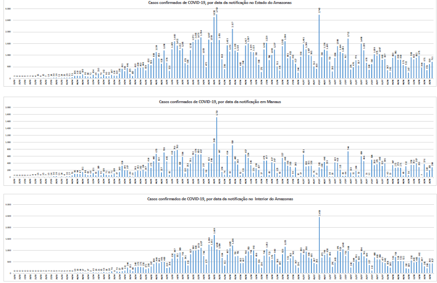 Além da capital, os 61 municípios têm casos confirmados: Coari (6.790); Parintins (3.803); São Gabriel da Cachoeira (3.732); Manacapuru (3.550); Tefé (3.356); Humaitá (2.753); Barcelos (2.352); Lábrea (2.177); Itacoatiara (2.027); Presidente Figueiredo (1.932); Santa Isabel do Rio Negro (1.904); Eirunepé (1.736); Tabatinga (1.731); Iranduba (1.701); Benjamin Constant (1.536); Ipixuna (1.337); Rio Preto da Eva (1.286); Maués (1.268); Careiro (1.243); São Paulo de Olivença (1.243); Manicoré (1.211); Autazes (1.210); Alvarães (1.205); Santo Antônio do Içá (1.173); Pauini (1.151); Boca do Acre (1.041); Tapauá (968); Guajará (865); Carauari (861); Atalaia do Norte (853); Nova Olinda do Norte (850); Barreirinha (825); Urucurituba (762); Fonte Boa (756); Anori (729); Beruri (713); Borba (696); Novo Aripuanã (667); Uarini (652); Anamã (645); Itapiranga (610); Nhamundá (591); Amaturá (583); Tonantins (571); Itamarati (550); Urucará (549); São Sebastião do Uatumã (526); Juruá (478); Manaquiri (451); Maraã (437); Japurá (414); Canutama (374); Jutaí (339); Novo Airão (317); Boa Vista do Ramos (309); Caapiranga (278); Silves (257); Codajás (207); Careiro da Várzea (150); Envira (135) e Apuí (126).