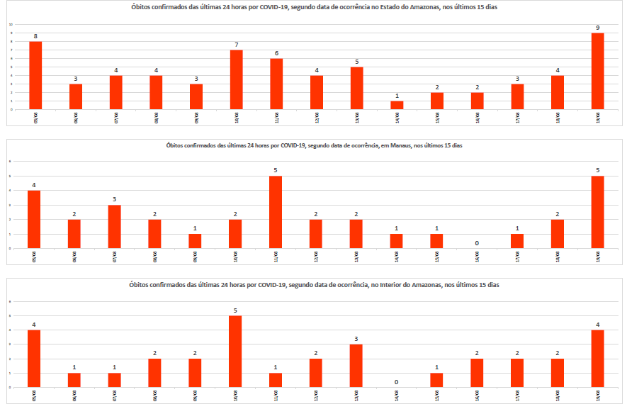 Conforme o boletim, foram confirmados nove óbitos por Covid-19 ocorridos nas últimas 24 horas, elevando para 3.533 o total de mortes. Na capital, de acordo com dados da Prefeitura de Manaus, nesta terça-feira (18/08), foram registrados 32 sepultamentos e cinco óbitos em domicílio, sendo quatro por Covid-19.