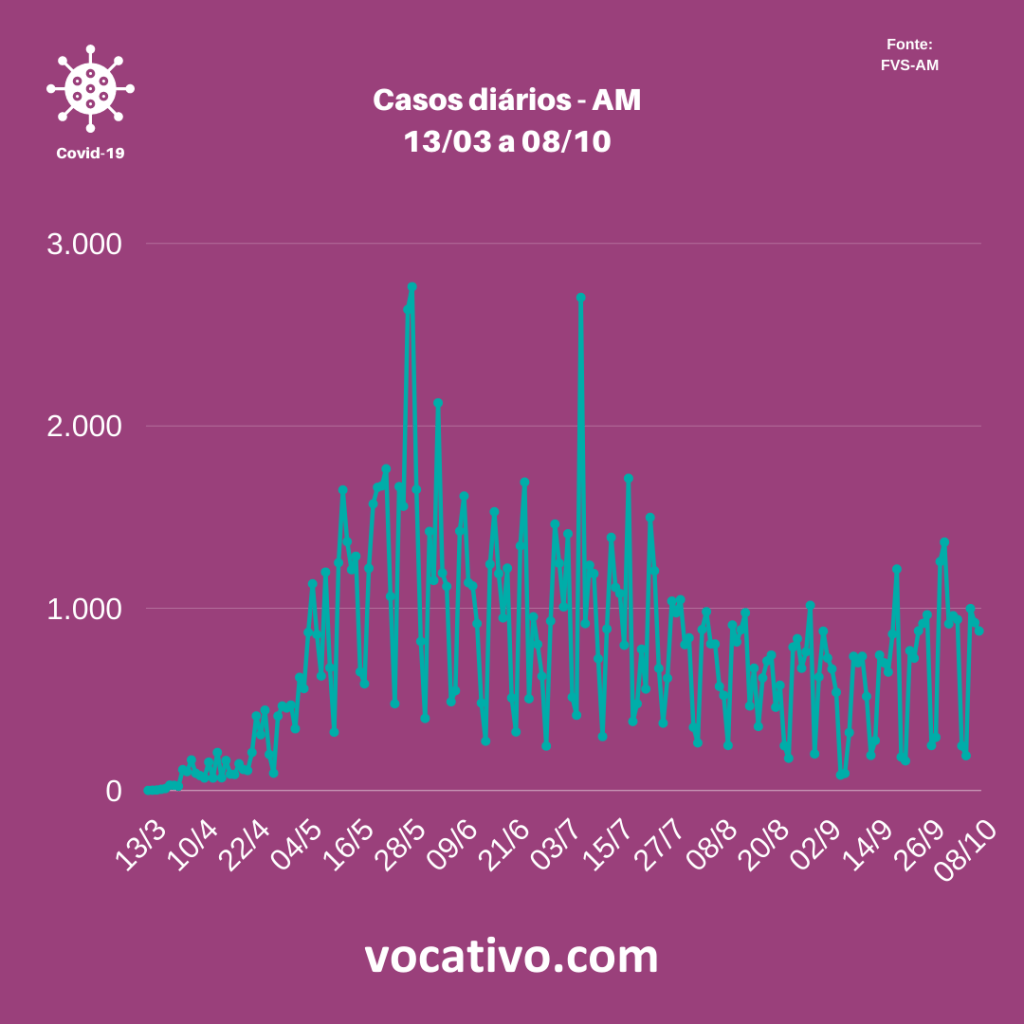 O Amazonas registrou 875 novos casos de Covid-19 nesta quinta-feira (08/10), fazendo o número total de infectados chegar a 145.367 em todo estado. A informação consta no Boletim Diário Covid-19 da Fundação de Vigilância em Saúde do Amazonas (FVS-AM), edição nº 189. Os dados na íntegra podem ser acessados diretamente no site do órgão.