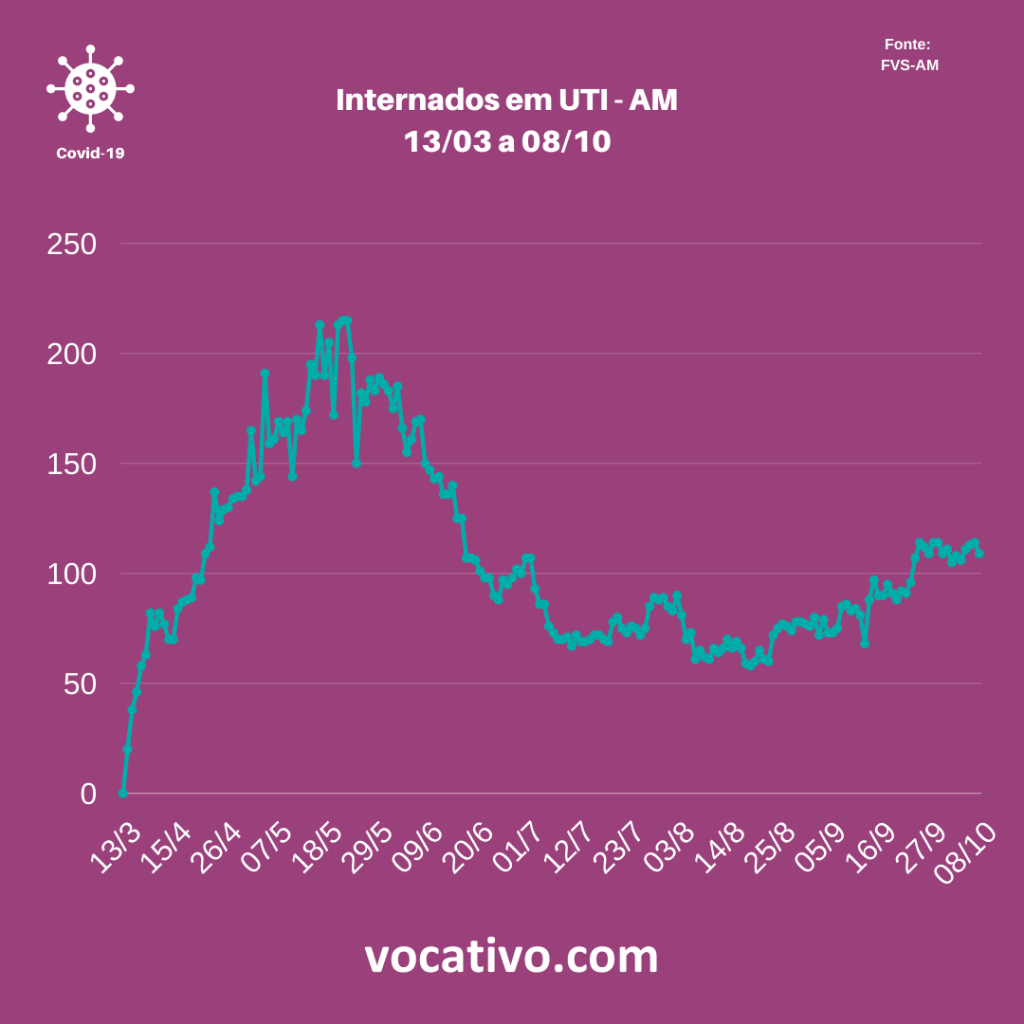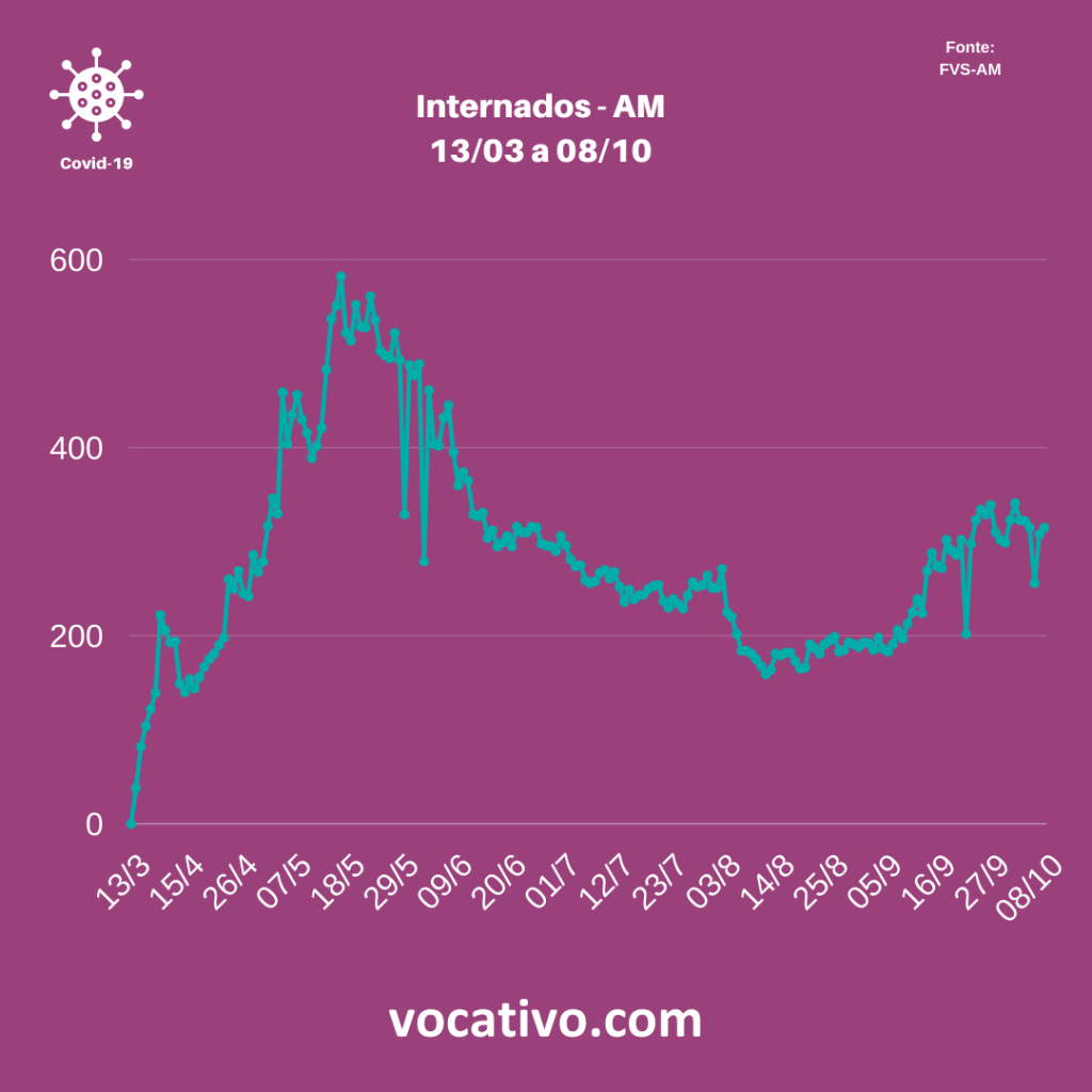 Entre os casos confirmados de Covid-19 no Amazonas, há 315 pacientes internados, sendo 205 em leitos clínicos (86 na rede privada e 119 na rede pública), 109 em UTI (54 na rede privada e 55 na rede pública) e um em sala vermelha, estrutura voltada à assistência temporária para estabilização de pacientes críticos/graves para posterior encaminhamento a outros pontos da rede de atenção à saúde.