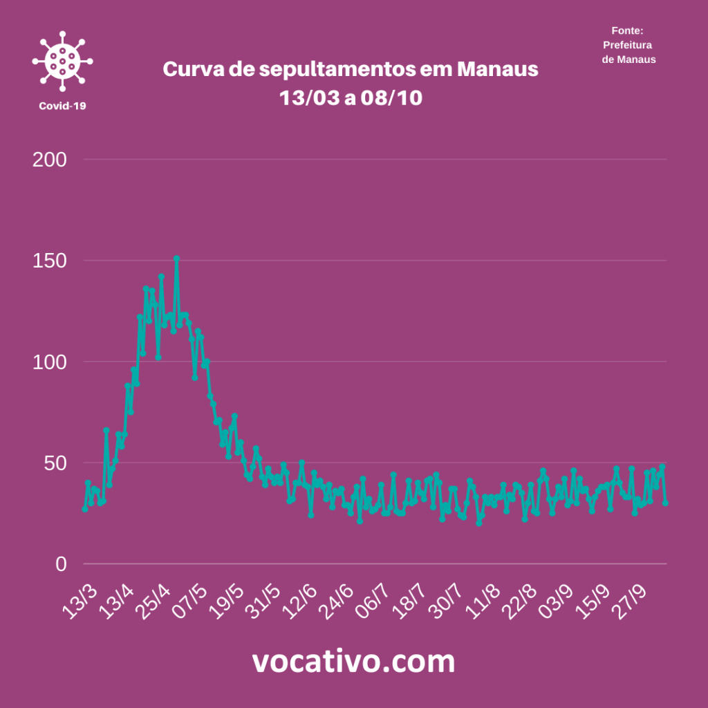 Conforme o boletim, foram confirmados três óbitos por Covid-19, sendo dois ocorridos nas últimas 24 horas e 11 óbitos foram encerrados por critério laboratorial, elevando para 4.215 o total de mortes. Na capital, de acordo com dados da Prefeitura de Manaus, nesta quarta-feira (07/10), foram registrados 30 sepultamentos e quatro óbitos em domicílio.