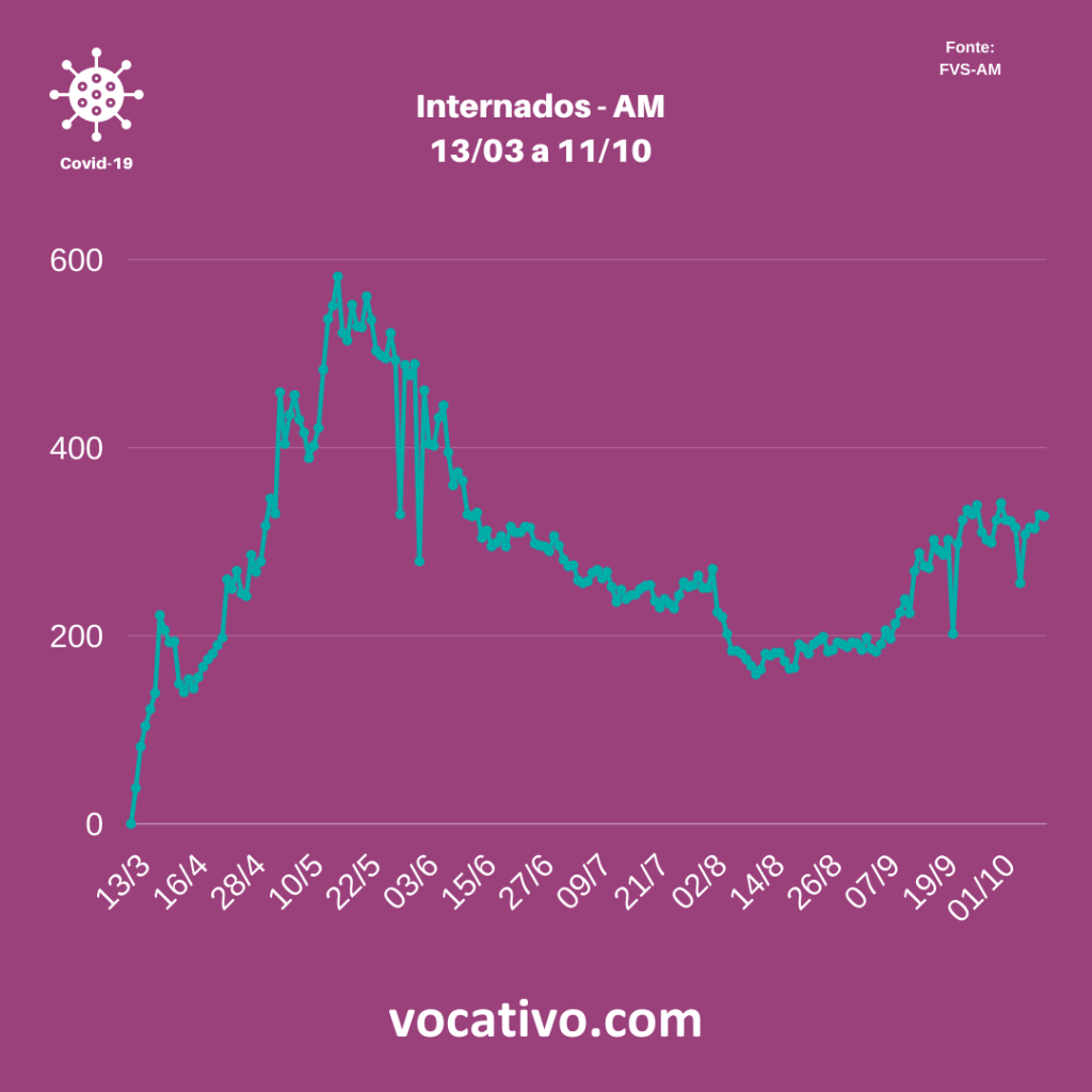 Entre os casos confirmados de Covid-19 no Amazonas, há 327 pacientes internados, sendo 226 em leitos clínicos (83 na rede privada e 143 na rede pública), 99 em UTI (55 na rede privada e 44 na rede pública) e dois em sala vermelha, estrutura voltada à assistência temporária para estabilização de pacientes críticos/graves para posterior encaminhamento a outros pontos da rede de atenção à saúde.