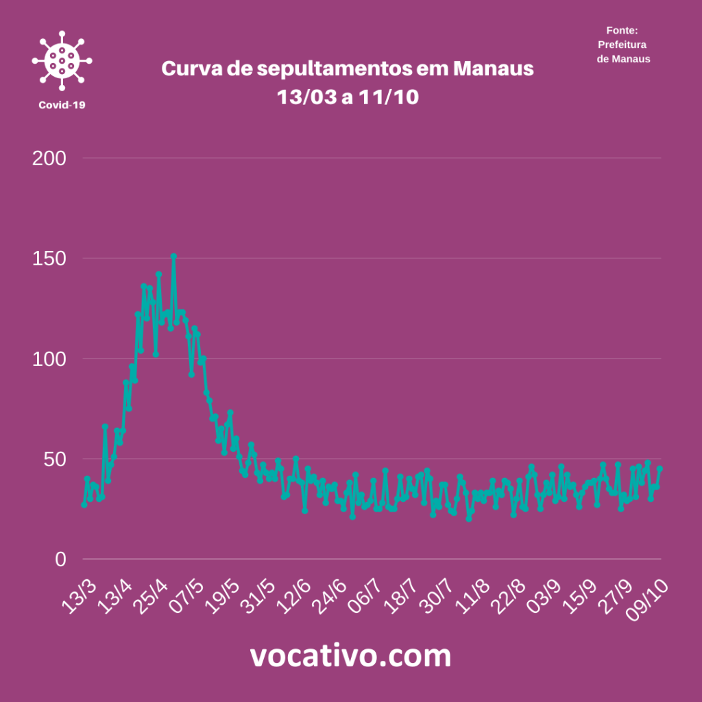 Conforme o boletim, foram confirmados oito óbitos por Covid-19, sendo quatro ocorridos no dia 10/10, elevando para 4.239 o total de mortes. Na capital, de acordo com dados da Prefeitura de Manaus, neste sábado-feira (10/10), foram registrados 45 sepultamentos e cinco óbitos em domicílio. O boletim acrescenta ainda que 17.609 pessoas com diagnóstico de Covid-19 estão sendo acompanhadas, o que corresponde a 11,94% dos casos confirmados ativos.