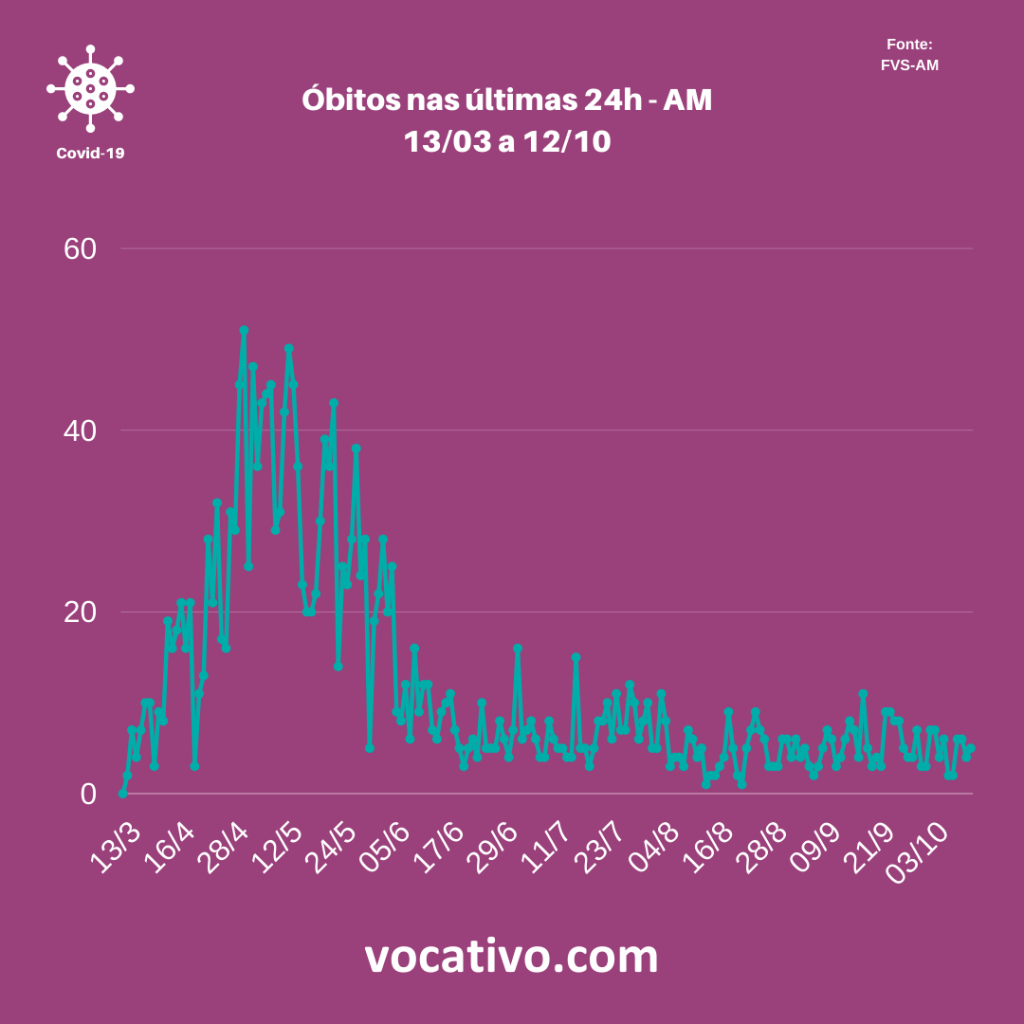 Ainda de acordo com o boletim, foram confirmados oito óbitos por Covid-19, sendo cinco ocorridos no dia 11/10 e três óbitos foram encerrados por critério clínico epidemiológico, elevando para 4.247 o total de mortes. Na capital, de acordo com dados da Prefeitura de Manaus, neste domingo (11/10), foram registrados 35 sepultamentos e sete óbitos em domicílio.
