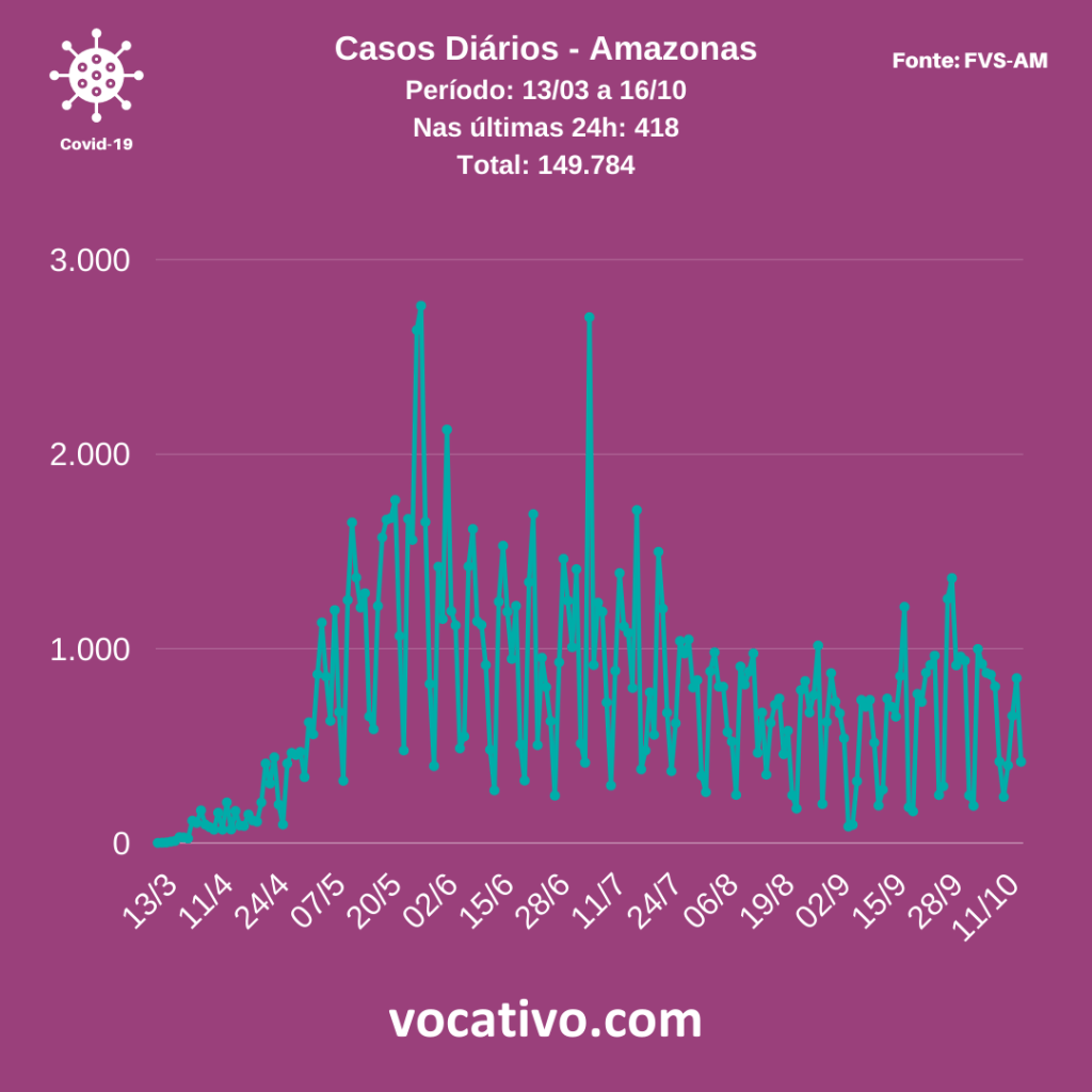 A Fundação de Vigilância em Saúde do Amazonas (FVS-AM), divulga nesta sexta-feira (16/10), o boletim Diário Epidemiológico da Covid-19. A edição nº 196 registra 418 novos casos de Covid-19, totalizando 149.784 casos da doença no estado. Os dados na íntegra podem ser acessados diretamente no site do órgão.