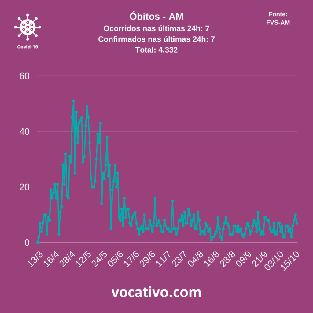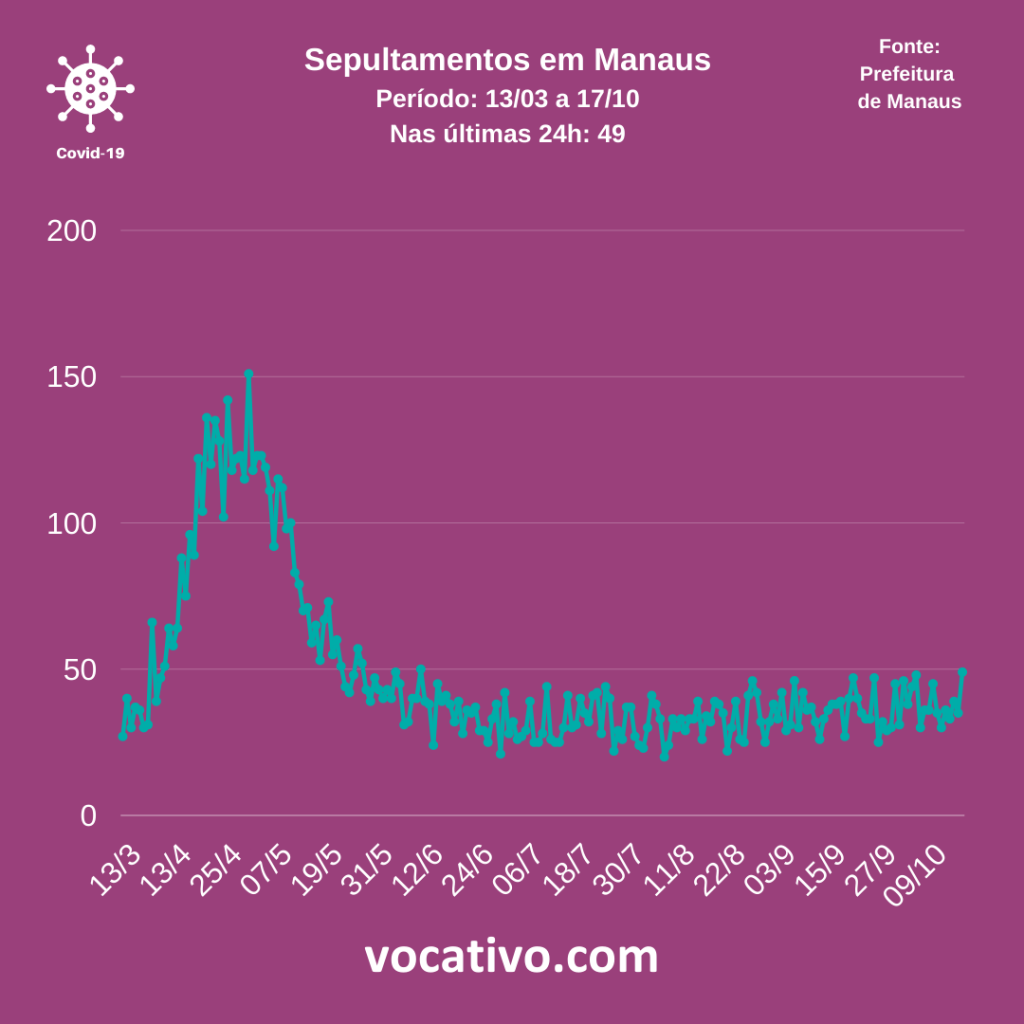 Conforme o boletim, foram confirmados sete óbitos por Covid-19, sendo seis ocorridos no dia 17/10 e um óbito foi encerrado por critério clínico epidemiológico, elevando para 4.332 o total de mortes. Na capital, de acordo com dados da Prefeitura de Manaus, neste sábado (17/10), foram registrados 49 sepultamentos e seis óbitos em domicílio.