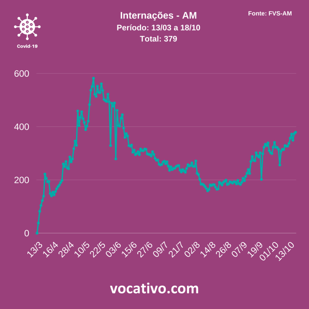 Entre os casos confirmados de Covid-19 no Amazonas, há 379 pacientes internados, sendo 272 em leitos clínicos (73 na rede privada e 199 na rede pública), 101 em UTI (48 na rede privada e 53 na rede pública) e seis em sala vermelha, estrutura voltada à assistência temporária para estabilização de pacientes críticos/graves para posterior encaminhamento a outros pontos da rede de atenção à saúde.