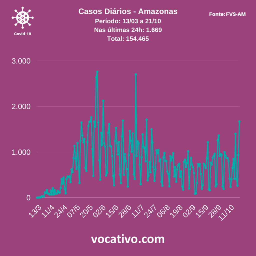 O Amazonas atingiu 154.465 casos de Covid-19 nesta quarta-feira (21/10). A informação consta no Boletim Diário Covid-19 da Fundação de Vigilância em Saúde do Amazonas (FVS-AM), edição nº 201. Nas últimas 24 horas foram registrados 1.669 novos casos da doença. Os dados na íntegra podem ser acessados diretamente no site do órgão.