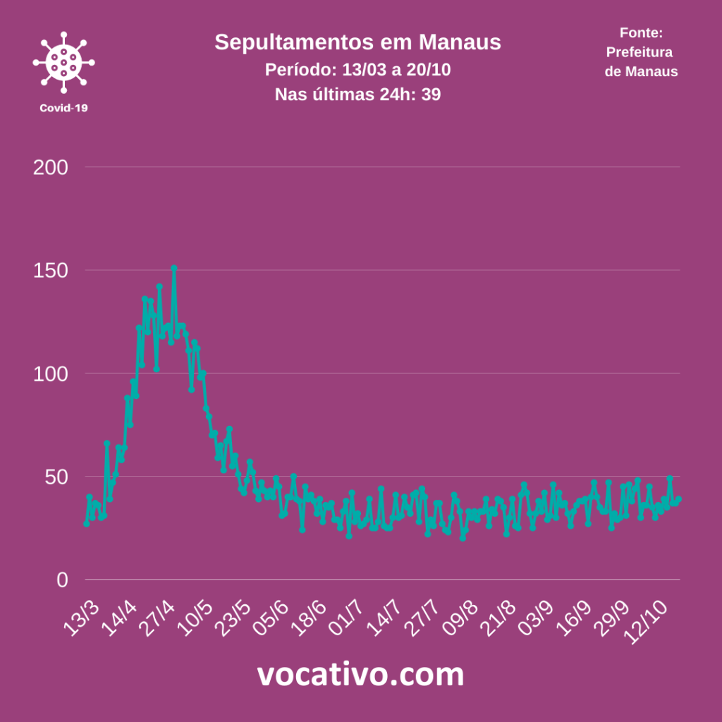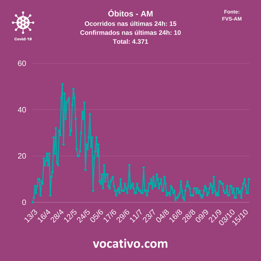 Conforme o boletim, foram confirmados 15 óbitos por Covid-19, sendo 10 ocorridos no dia 20 de outubro e cinco óbitos encerrados por critério clínico e epidemiológico, elevando para 4.371 o total de mortes. Na capital, de acordo com dados da Prefeitura de Manaus, nesta terça-feira (20/10), foram registrados 39 sepultamentos e cinco óbitos em domicílio.