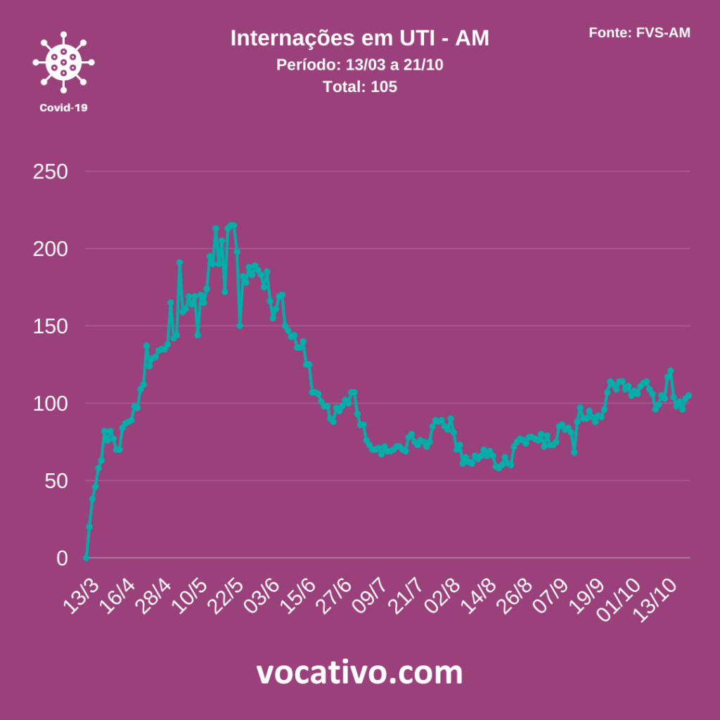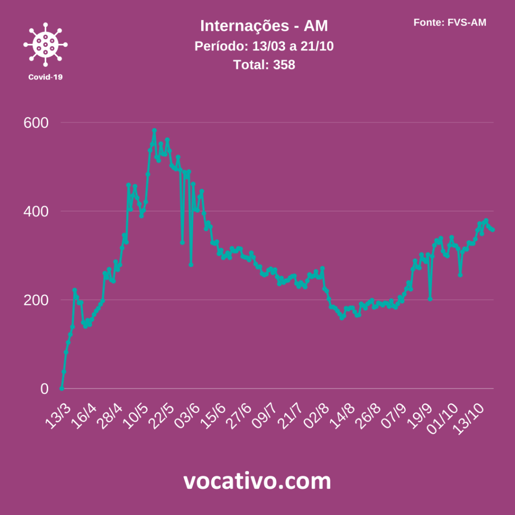Entre os casos confirmados de Covid-19 no Amazonas, há 358 pacientes internados, sendo 242 em leitos clínicos (58 na rede privada e 184 na rede pública), 105 em UTI (51 na rede privada e 54 na rede pública) e 11 em sala vermelha, estrutura voltada à assistência temporária para estabilização de pacientes críticos/graves para posterior encaminhamento a outros pontos da rede de atenção à saúde.