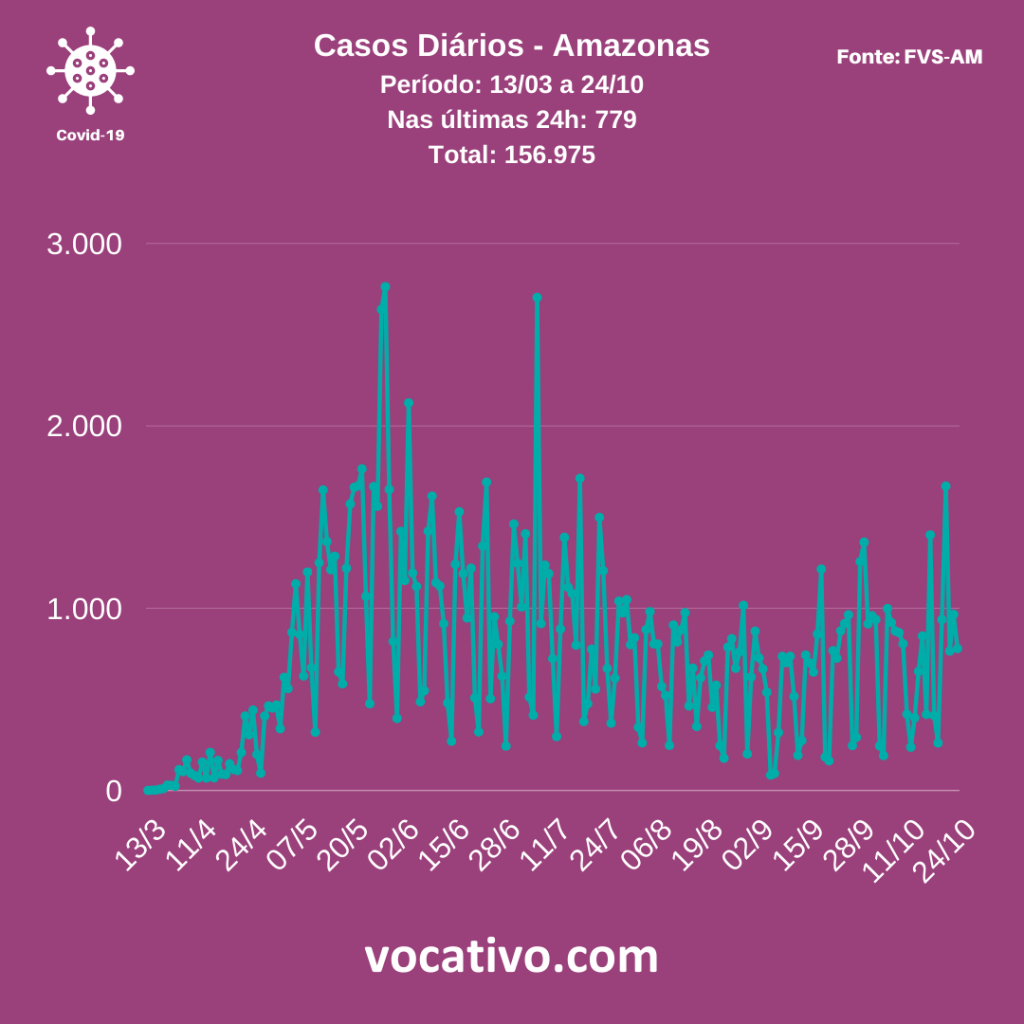 O Amazonas atingiu 156.975 casos de Covid-19 neste sábado (24/10). A informação consta no Boletim Diário Covid-19 da Fundação de Vigilância em Saúde do Amazonas (FVS-AM), edição nº 204, que aponta ainda 779 novos casos da doença registrados nas últimas 24 horas. Os dados na íntegra podem ser acessados diretamente no site do órgão.