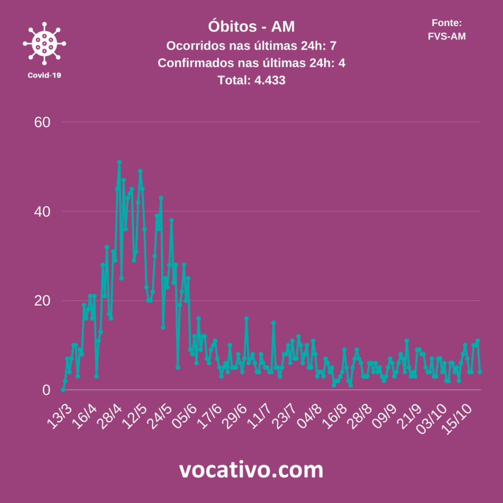 Entre pacientes em Manaus, há o registro de 2.818 óbitos confirmados em decorrência do novo coronavírus. No interior, são 61 municípios com óbitos confirmados até o momento, totalizando 1.615.