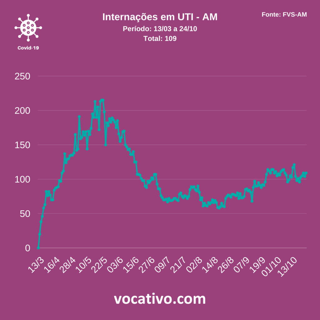 Entre os casos confirmados de Covid-19 no Amazonas, há 342 pacientes internados, sendo 226 em leitos clínicos (50 na rede privada e 176 na rede pública), 109 em UTI (48 na rede privada e 61 na rede pública) e sete em sala vermelha, estrutura voltada à assistência temporária para estabilização de pacientes críticos/graves para posterior encaminhamento a outros pontos da rede de atenção à saúde.