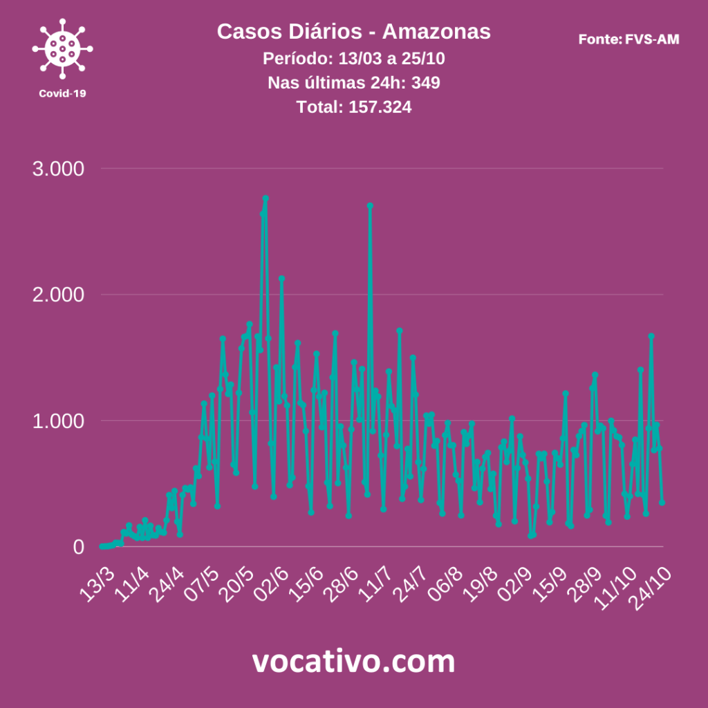 O Amazonas atingiu 157.324 casos de Covid-19 neste domingo (25/10). A informação consta no Boletim Diário Covid-19 da Fundação de Vigilância em Saúde do Amazonas (FVS-AM), edição nº 205, que aponta ainda 349 novos casos da doença registrados nas últimas 24 horas. Os dados na íntegra podem ser acessados diretamente no site do órgão.