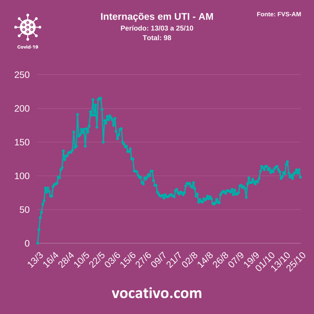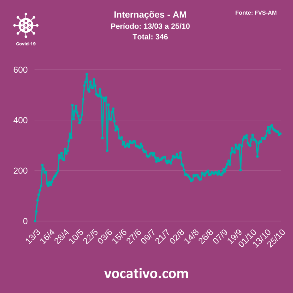 Entre os casos confirmados de Covid-19 no Amazonas, há 346 pacientes internados, sendo 237 em leitos clínicos (51 na rede privada e 186 na rede pública), 98 em UTI (48 na rede privada e 50 na rede pública) e 11 em sala vermelha na rede pública. A sala vermelha é a estrutura voltada à assistência temporária para estabilização de pacientes críticos/graves para posterior encaminhamento a outros pontos da rede de atenção à saúde.
