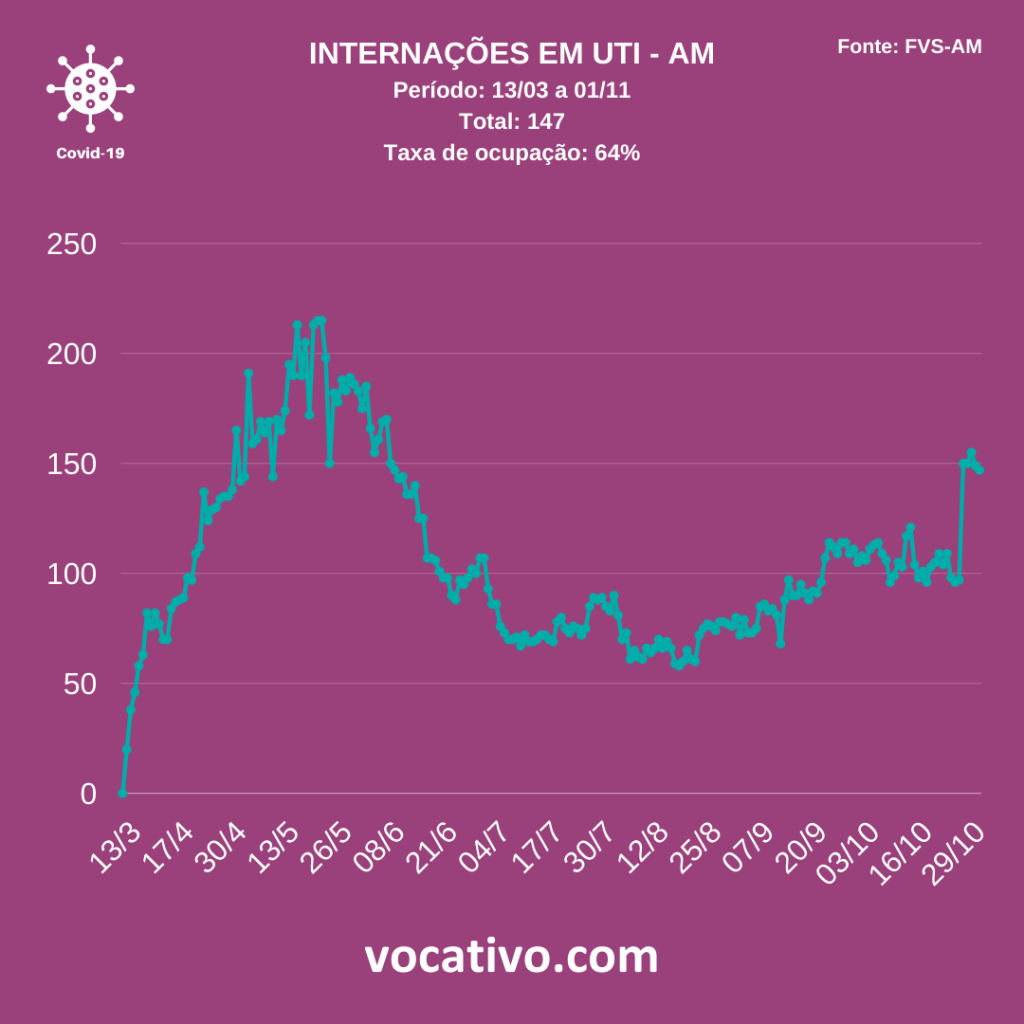 Conforme o boletim, foram confirmados 12 óbitos por Covid-19, sendo seis ocorridos nas últimas 24 horas e seis óbitos foram encerrados por critério laboratorial, elevando para 4.555 o total de mortes. Na capital, de acordo com dados da Prefeitura de Manaus, neste sábado (31/10), foram registrados sete sepultamentos.