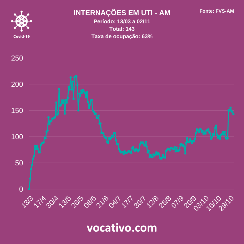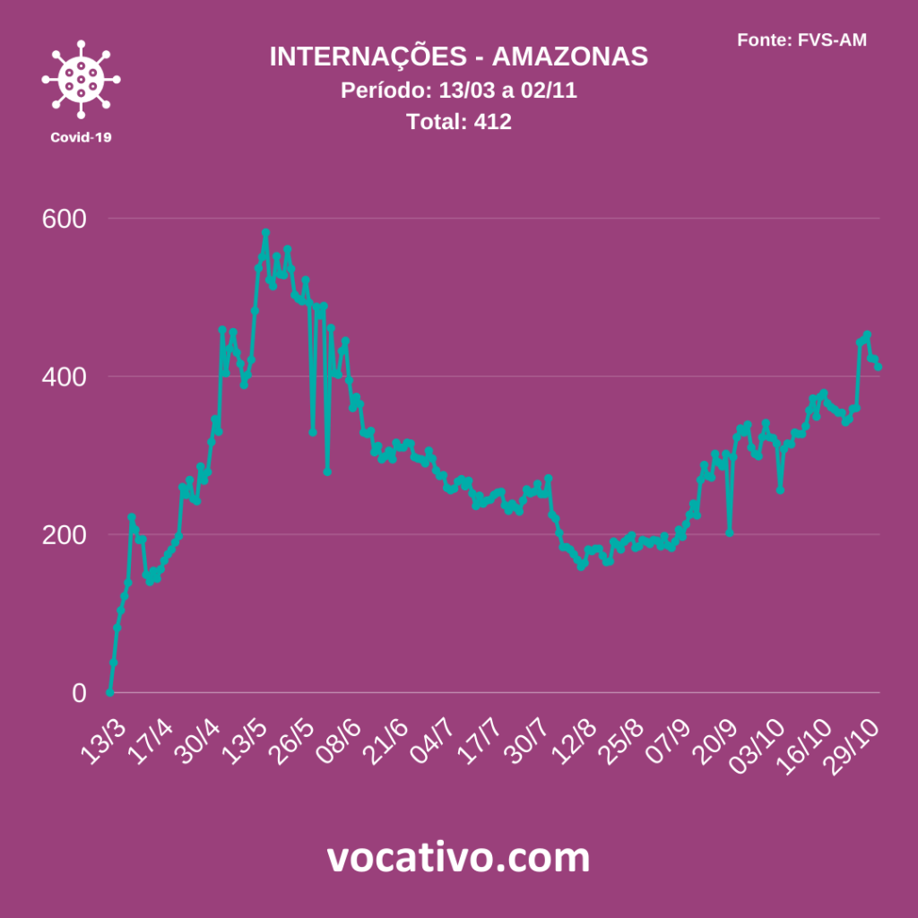 Entre os casos confirmados de Covid-19 no Amazonas, há 412 pacientes internados, sendo 267 em leitos clínicos (55 na rede privada e 212 na rede pública), 143 em UTI (45 na rede privada e 98 na rede pública) e dois em sala vermelha, estrutura voltada à assistência temporária para estabilização de pacientes críticos/graves para posterior encaminhamento a outros pontos da rede de atenção à saúde.