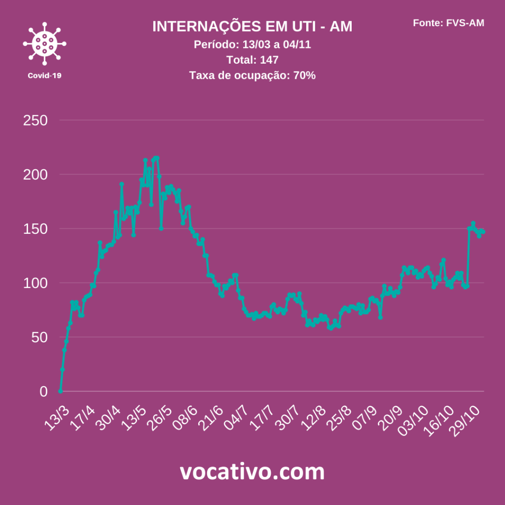 Conforme o boletim, foram confirmados 15 óbitos por covid-19, sendo sete ocorridos no dia 03/11 e oito óbitos foram encerrados por critérios clínicos, de imagem, clínico-epidemiológico ou laboratorial, elevando para 4.588 o total de mortes. Na capital, de acordo com dados da Prefeitura de Manaus, nesta terça-feira (03/11), foram registrados dois sepultamentos de covid-19.