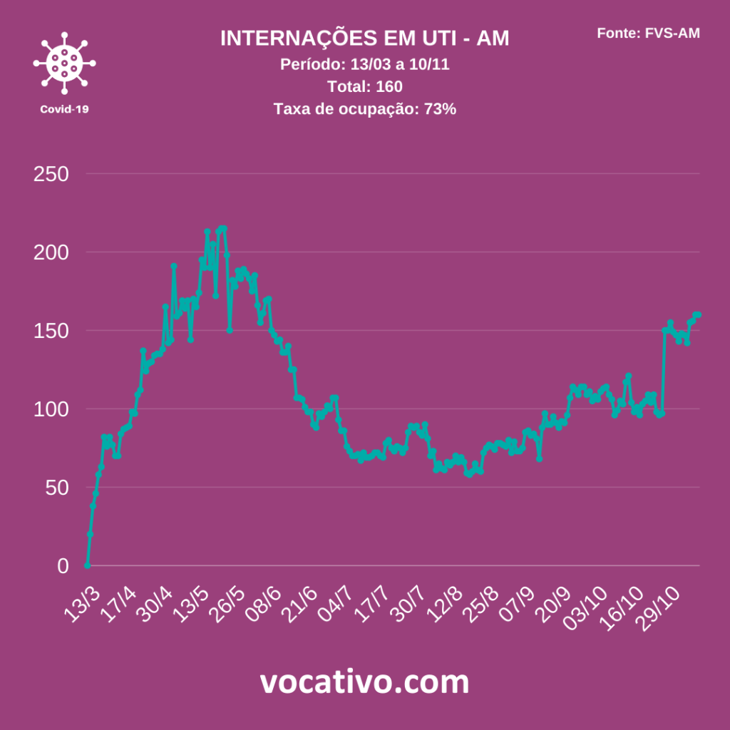Entre os casos confirmados de Covid-19 no Amazonas, há 397 pacientes internados, sendo 230 em leitos clínicos (42 na rede privada e 188 na rede pública), 160 em UTI (47 na rede privada e 113 na rede pública) e sete em sala vermelha, estrutura voltada à assistência temporária para estabilização de pacientes críticos/graves para posterior encaminhamento a outros pontos da rede de atenção à saúde.
