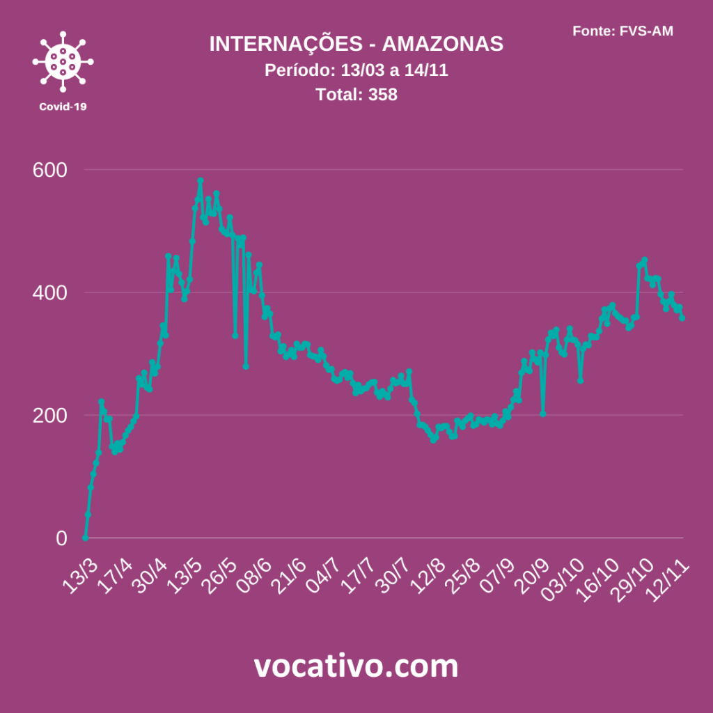 Entre os casos confirmados de Covid-19 no Amazonas, há 358 pacientes internados, sendo 196 em leitos clínicos (45 na rede privada e 151 na rede pública), 158 em UTI (42 na rede privada e 116 na rede pública) e quatro em sala vermelha, estrutura voltada à assistência temporária para estabilização de pacientes críticos/graves para posterior encaminhamento a outros pontos da rede de atenção à saúde.