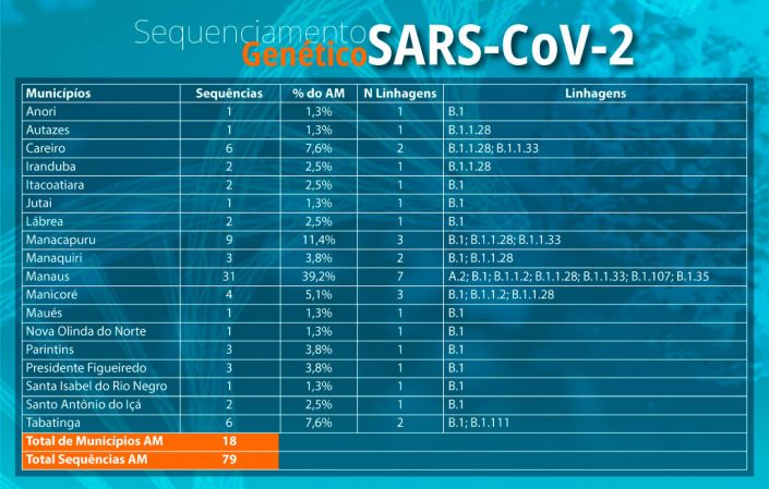 As amostras sequenciadas no ILMD/Fiocruz Amazônia são provenientes dos municípios de Anori, Autazes, Careiro, Iranduba, Itacoatiara, Jutaí, Lábrea, Manacapuru, Manaquiri, Manicoré, Maués, Nova Olinda do Norte, Parintins, Presidente Figueiredo, Santa Isabel do Rio Negro, Santo Antônio do Içá, e Tabatinga, além da capital Manaus.