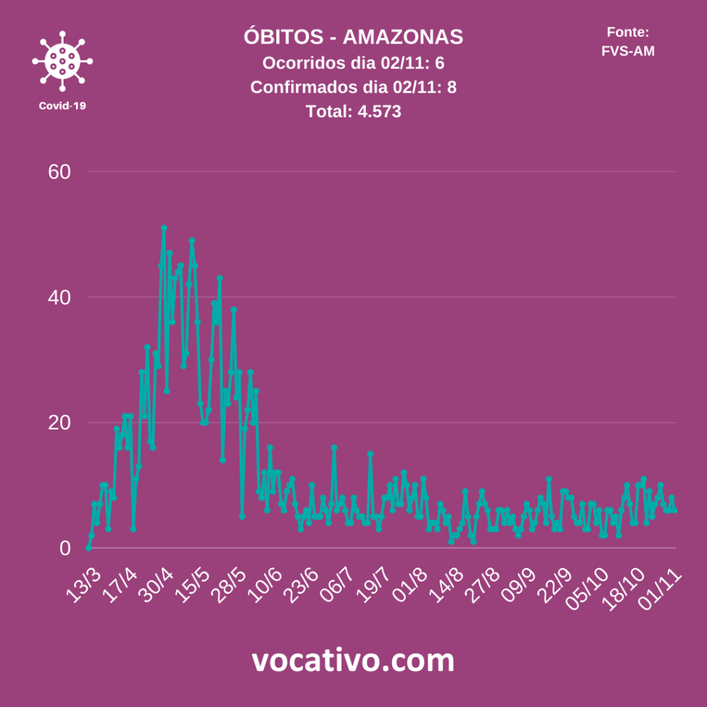 Conforme o boletim, foram confirmados oito óbitos por Covid-19, sendo cinco ocorridos no dia 21/11 e três óbitos foram encerrados por critérios clínicos, de imagem, clínico-epidemiológico ou laboratorial, elevando para 4.779 o total de mortes. Na capital, de acordo com dados da Prefeitura de Manaus, neste sábado (21/11), foram registrados 22 sepultamentos, sendo 3 por Covid-19. Entre pacientes em Manaus, há o registro de 3.042 óbitos confirmados em decorrência do novo coronavírus. No interior, são 61 municípios com óbitos confirmados até o momento, totalizando 1.737.