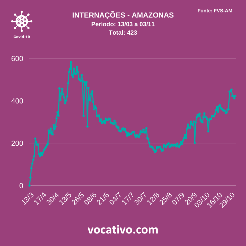 Entre os casos confirmados de Covid-19 no Amazonas, há 391 pacientes internados, sendo 217 em leitos clínicos (49 na rede privada e 168 na rede pública), 170 em UTI (48 na rede privada e 122 na rede pública) e quatro em sala vermelha, estrutura voltada à assistência temporária para estabilização de pacientes críticos/graves para posterior encaminhamento a outros pontos da rede de atenção à saúde.