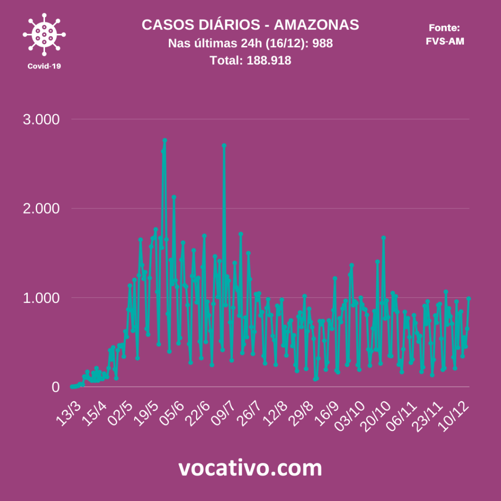 Segundo a Fundação de Vigilância em Saúde do Amazonas (FVS-AM) o estado registrou 988 novos casos de Covid-19 nesta quarta-feira (16/12). Os números de hoje totalizam 188.918 casos da doença no Estado. A informação consta no Boletim Diário de Covid-19, edição de nº 257. Você pode conferir todos os detalhes do boletim no site da FVS-AM.