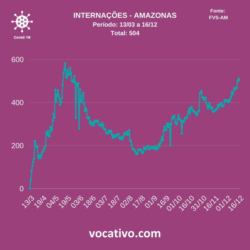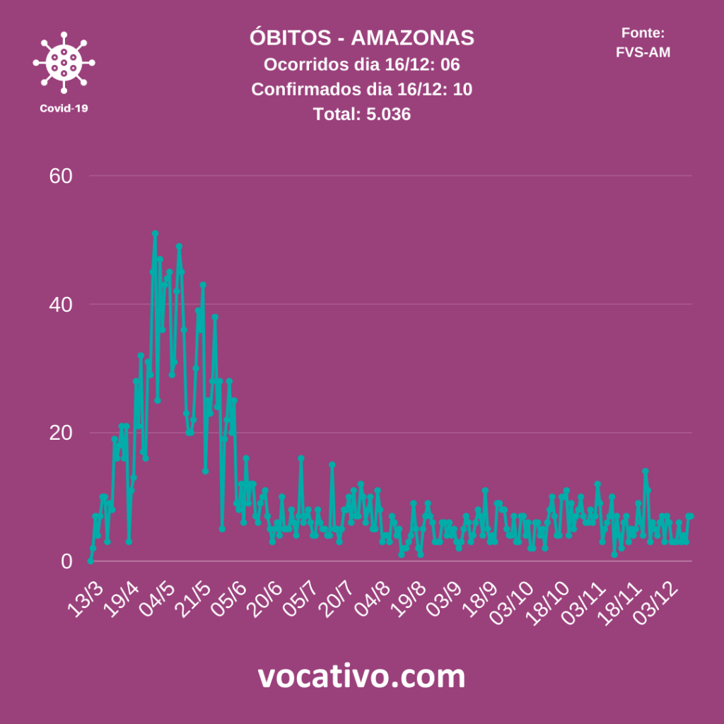 Conforme o boletim, foram confirmados 10 óbitos por Covid-19, sendo seis ocorridos no dia 15/12 e quatro óbitos foram encerrados por critérios clínicos, de imagem, clínico-epidemiológico ou laboratorial, elevando para 5.036 o total de mortes. Na capital, de acordo com dados da Prefeitura de Manaus, nesta quarta-feira (16/12), foram registrados sete sepultamentos por Covid-19.