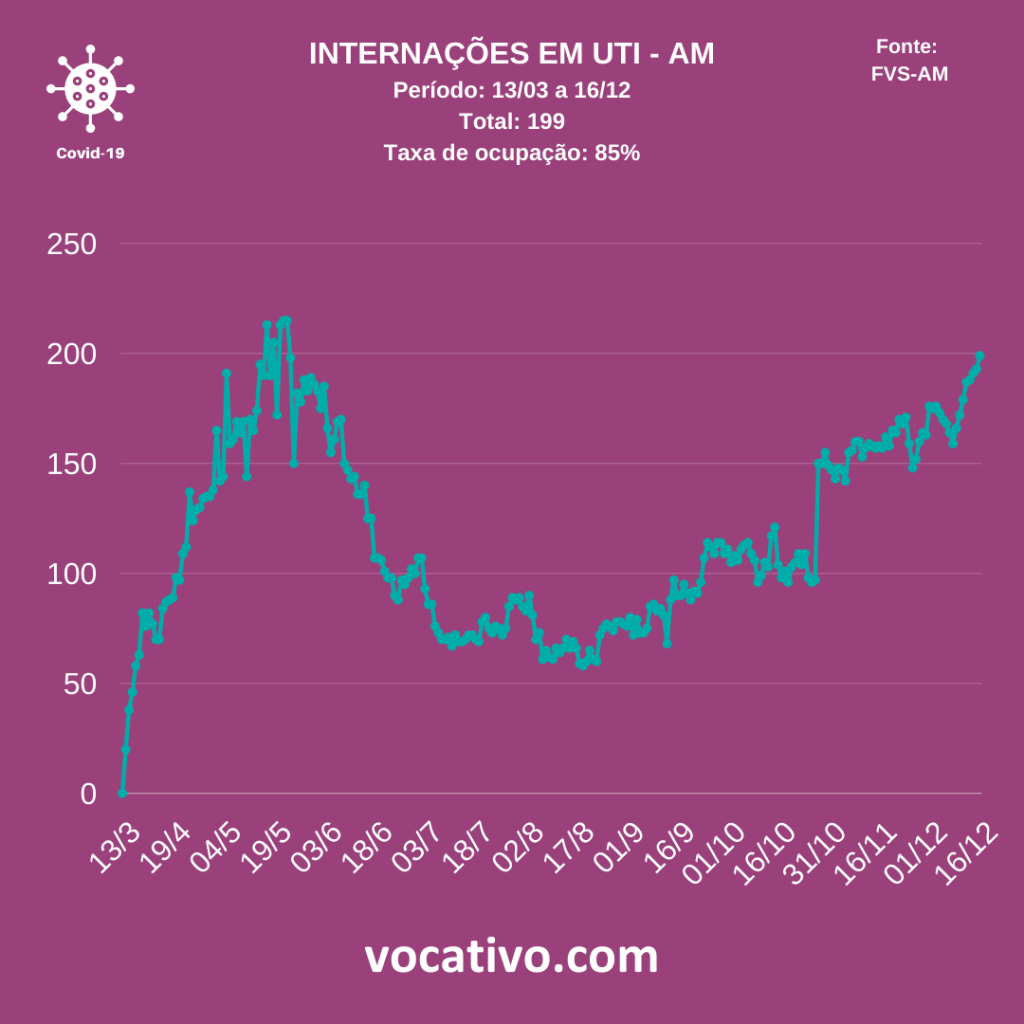 Entre os casos confirmados de Covid-19 no Amazonas, há 504 pacientes internados, sendo 301 em leitos clínicos (73 na rede privada e 228 na rede pública), 199 em UTI (66 na rede privada e 133 na rede pública) e quatro em sala vermelha, estrutura voltada à assistência temporária para estabilização de pacientes críticos/graves para posterior encaminhamento a outros pontos da rede de atenção à saúde. Atualmente, o índice de ocupação de leitos de UTI na rede pública é de 90% e na rede privada é de 80%. No total, 85% de todos os leios de UTI do estado estão lotados.