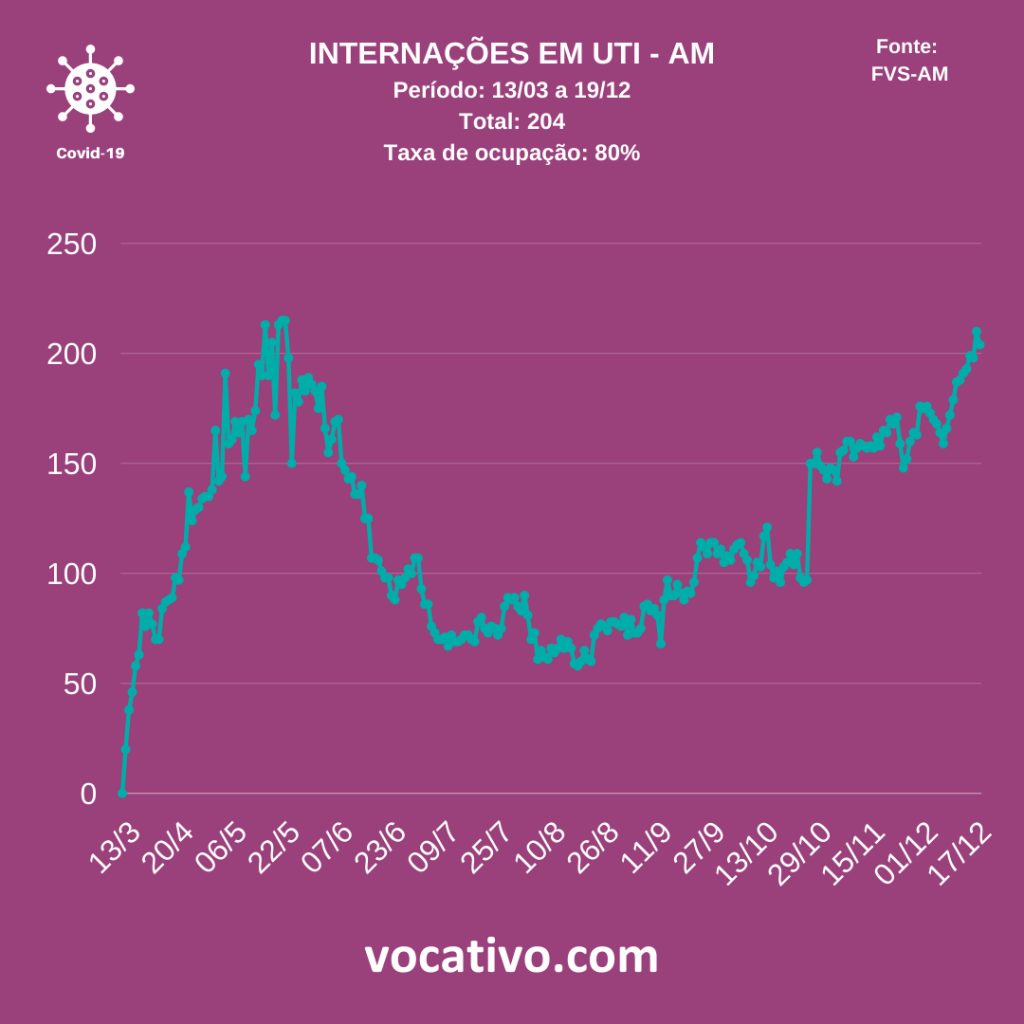 Segundo o boletim, foram confirmados 14 óbitos por Covid-19, quatro deles ocorridos na sexta-feira (18/12) e 10 encerrados por critérios clínicos, de imagem, clínico-epidemiológico ou laboratorial, elevando para 5.076 o total de mortes. Na capital, de acordo com dados da Prefeitura de Manaus, nesta sexta-feira (18/12), foram registrados 45 sepultamentos, sendo 11 por Covid-19.