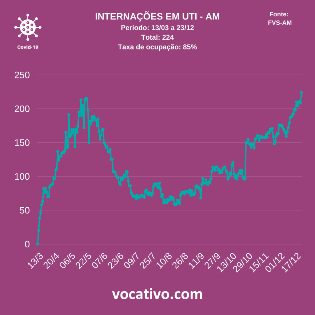 Dos 194.406 casos confirmados no Amazonas até esta quarta-feira (23/12), 78.258 são de Manaus (40,25%) e 116.148 do interior do estado (59,75%). O boletim acrescenta ainda que 23.273 pessoas com diagnóstico de Covid-19 estão sendo acompanhadas pelas secretarias municipais de saúde, o que corresponde a 11,97% dos casos confirmados ativos.