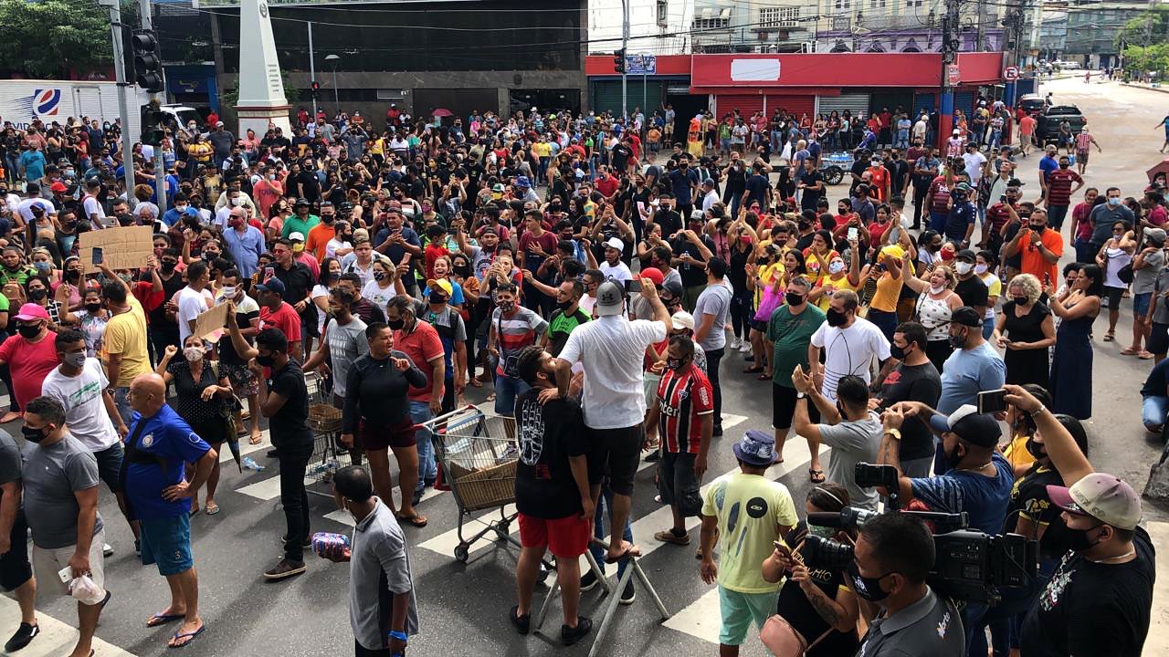 Ao som de “Queremos trabalhar” e “Fora Wilson Lima”, um grupo de dezenas de manifestantes realizou na manhã deste sábado um protesto nas ruas do centro de Manaus contra decreto governamental n° 43.234/2020. A decisão do governador Wilson Lima restringe o funcionamento das atividades não essenciais, no período de 26 de dezembro de 2020 a 10 de janeiro de 2021, como forma de conter o avanço da Covid-19 no estado.