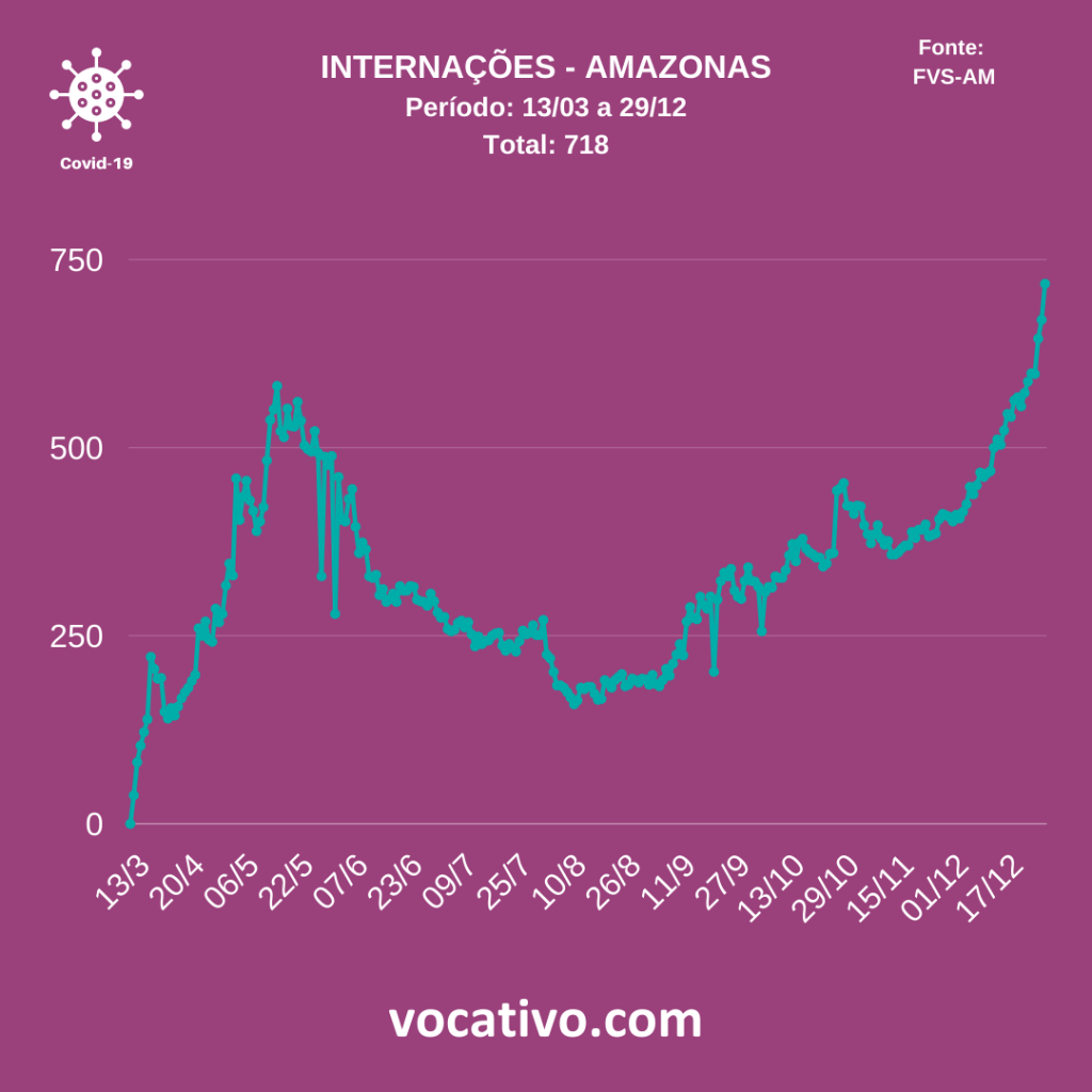 Entre os casos confirmados de Covid-19 no Amazonas, há 718 pacientes internados, sendo 450 em leitos (146 na rede privada e 304 na rede pública), 254 em UTI (93 na rede privada e 161 na rede pública) e 14 em sala vermelha, estrutura voltada à assistência temporária para estabilização de pacientes críticos/graves para posterior encaminhamento a outros pontos da rede de atenção à saúde.