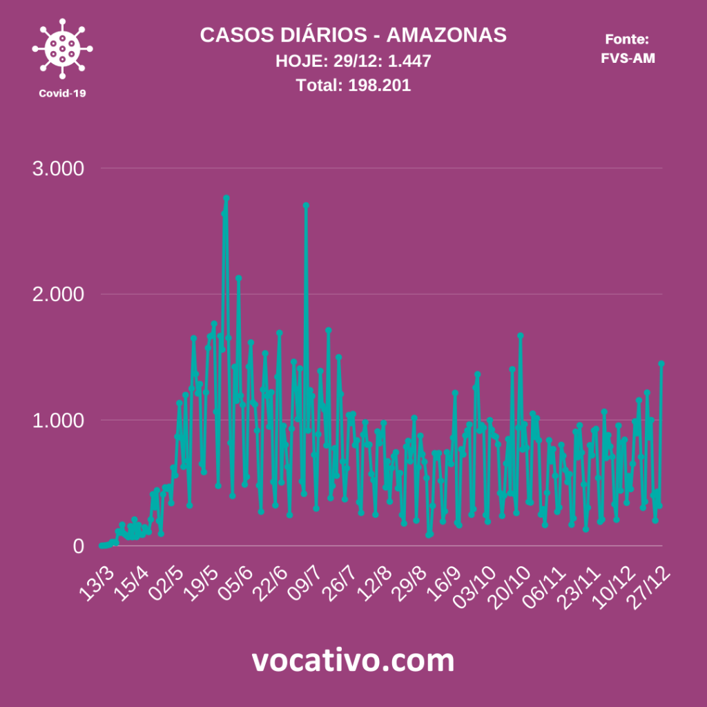 A Fundação de Vigilância em Saúde do Amazonas (FVS-AM) informou o diagnóstico de 1.447 novos casos de Covid-19, totalizando 198.201 casos da doença no estado. A informação consta no Boletim Diário de Covid-19, edição de nº 270. Dos 198.201 casos confirmados no Amazonas até esta terça-feira (29/12), 80.420 são de Manaus (40,57%) e 117.781 do interior do estado (59,43%).