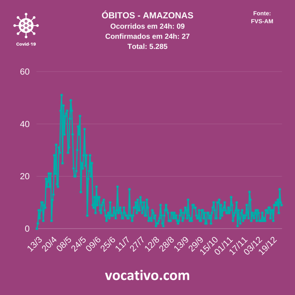 De acordo com o boletim, foram confirmados 27 óbitos por Covid-19, sendo nove ocorridos na quarta-feira (30/12), todos de Manaus, e 18 encerrados por critérios clínicos, de imagem, clínico-epidemiológico ou laboratorial, elevando para 5.285 o total de mortes.
