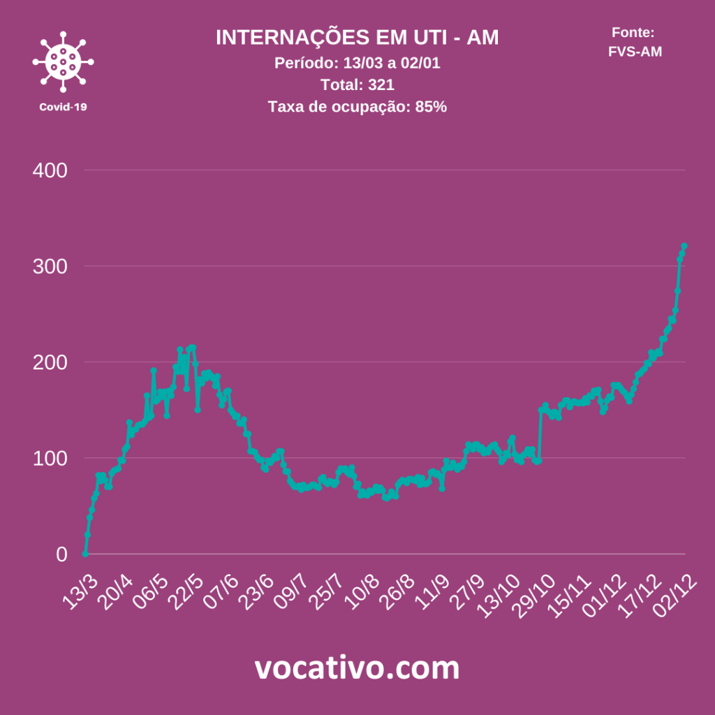 Entre os casos confirmados de Covid-19 no Amazonas, há 867 pacientes internados, sendo 519 em leitos (199 na rede privada e 320 na rede pública), 321 em UTI (118 na rede privada e 203 na rede pública). Atualmente, 85% das UTI’s do estado estão ocupadas, sendo 81% na rede pública e 92% na rede particular.